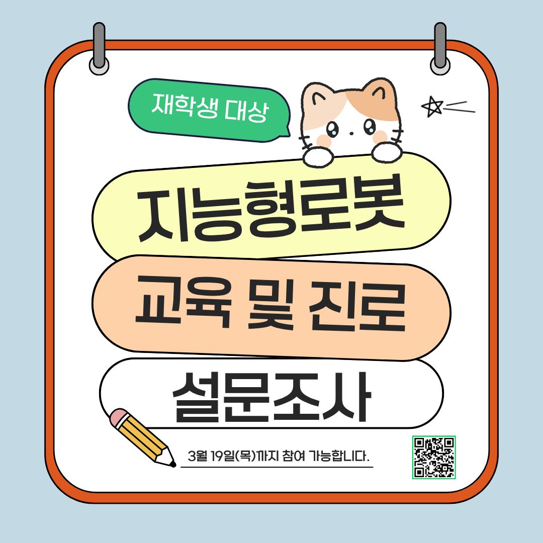 지능형로봇 컨소시엄 소속대학(한양대ERICA, 광운대, 부경대, 상명대, 영진전문대, 조선대, 한국공대) 재학생을 대상으로 진로와 전공 관련 설문조사를 진행합니다.